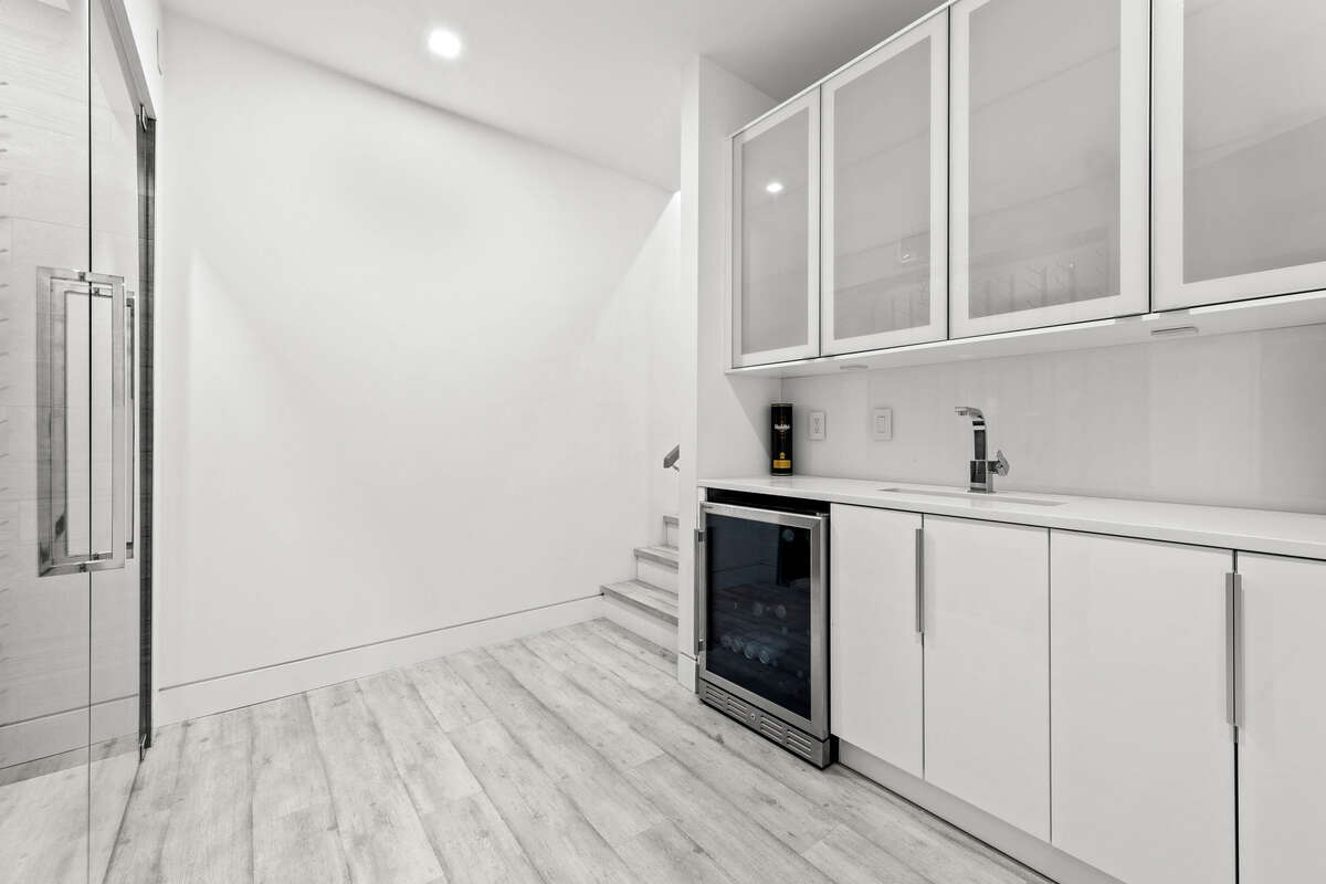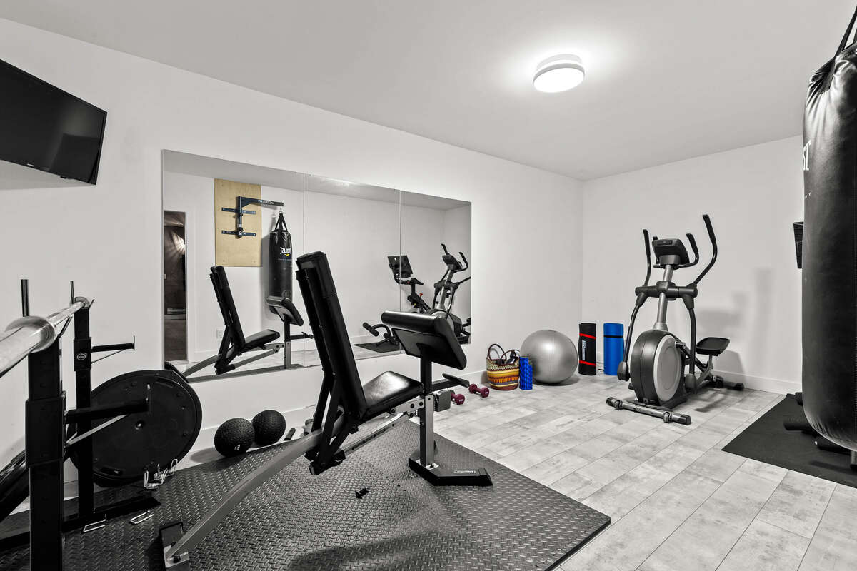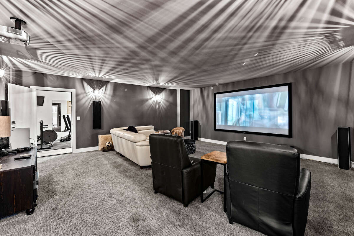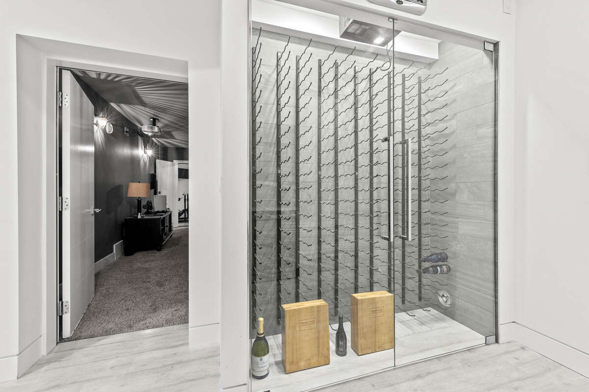 The lower level is designed for entertainment, featuring a floor-to-ceiling temperature-controlled WINE COOLER, a built-in bar with a beverage fridge, a THEATRE ROOM with SURROUND SOUND, and a HOME GYM with outdoor access x 2. A bonus flex space is ideal for a home business or room for the IN-LAWS? Along with two additional bedrooms and a four-piece bathroom.