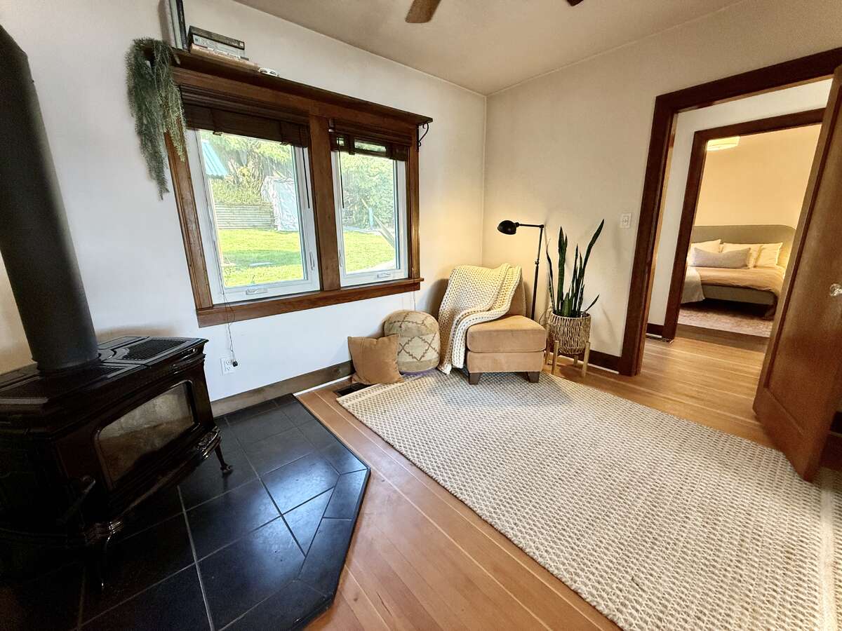 The home has a flexible layout that includes a 2-bedroom plus den main level with a self contained in-law suite and a partially unfinished basement. There is also a stand-alone studio on the property making is exceptionally versatile for family, guests, or creative work. Inside, you’ll find original fir floors, cove ceilings, character hardware, and a cozy den with WETT certified wood stove. The primary loft bedroom has breathtaking views, an office nook, changing area, ample storage, and a lovely ensuite with custom shower.