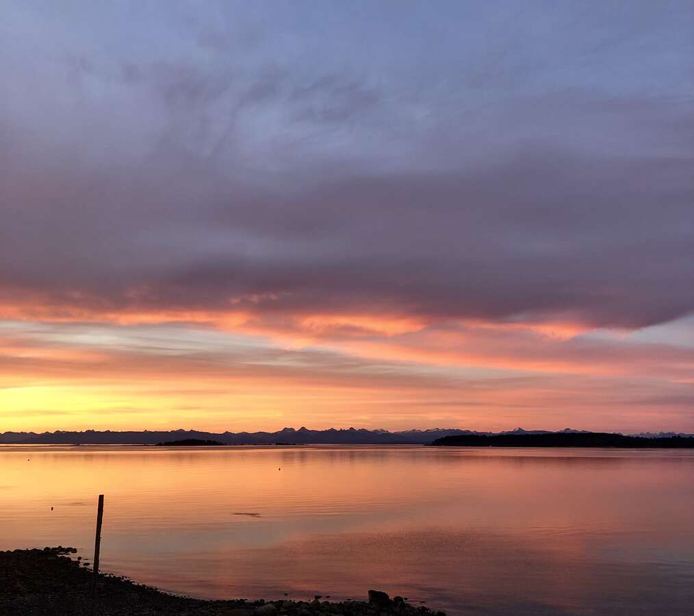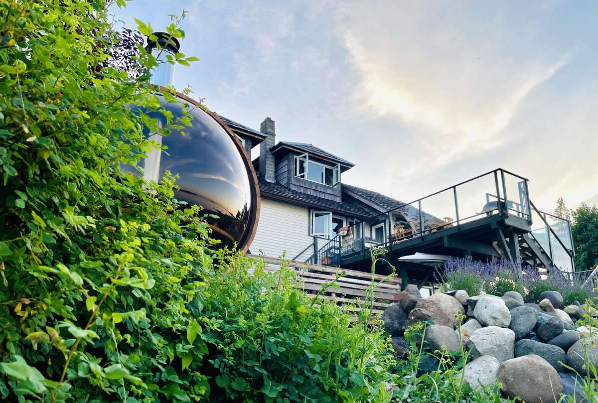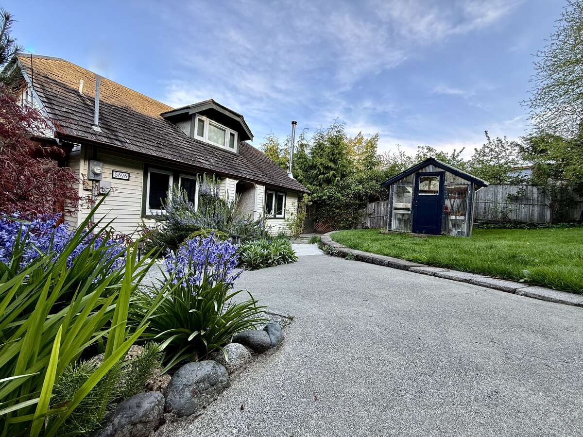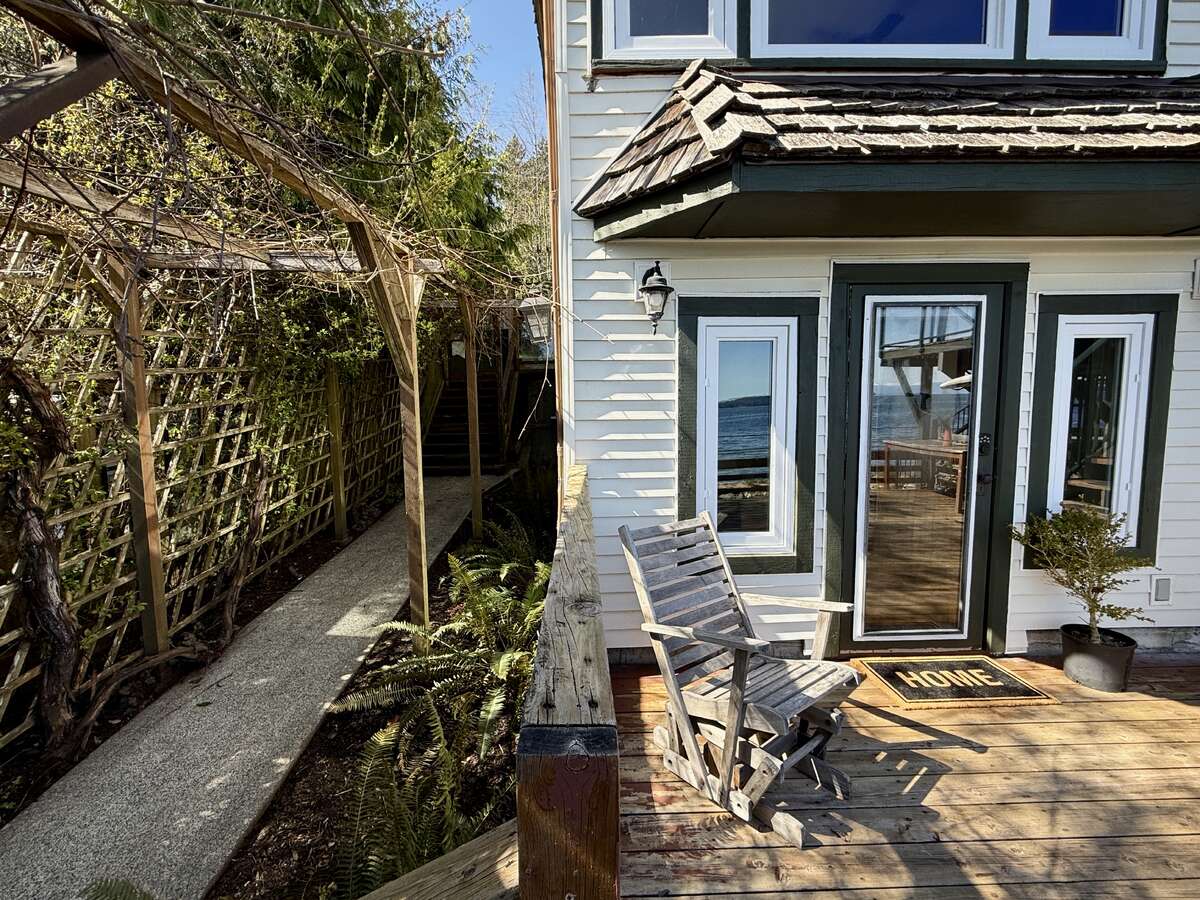 The fully enclosed yard is rich with established landscaping, including flowering shrubs, berries, and perennials with a massive rosemary, stunning peonies, rhododendron, Japanese maple, and a lavender hedge. A wood-fired sauna sits seaside with stone steps to the beach. A complete West Coast experience.