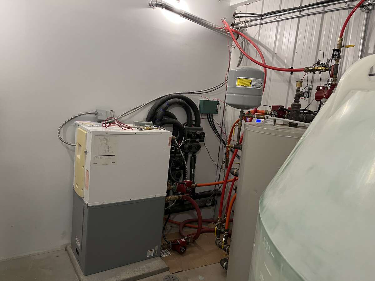 — Shop highlights • 6000 sqft engineered steel structure (100’ X 60’) with tin cladding inside and out. 4800 sqft of clear span shop area with 18’ walls on 6” concrete slab (35 MPa) thickened edges over heavy screw piles. • includes 60’ overhead two ton crane. • Geothermal heat pump in-floor heating on both levels for efficient even warmth. • 14’ X 16’ overhead door and 50’ X 17’ bi-folding diamond door plus two steel man doors.