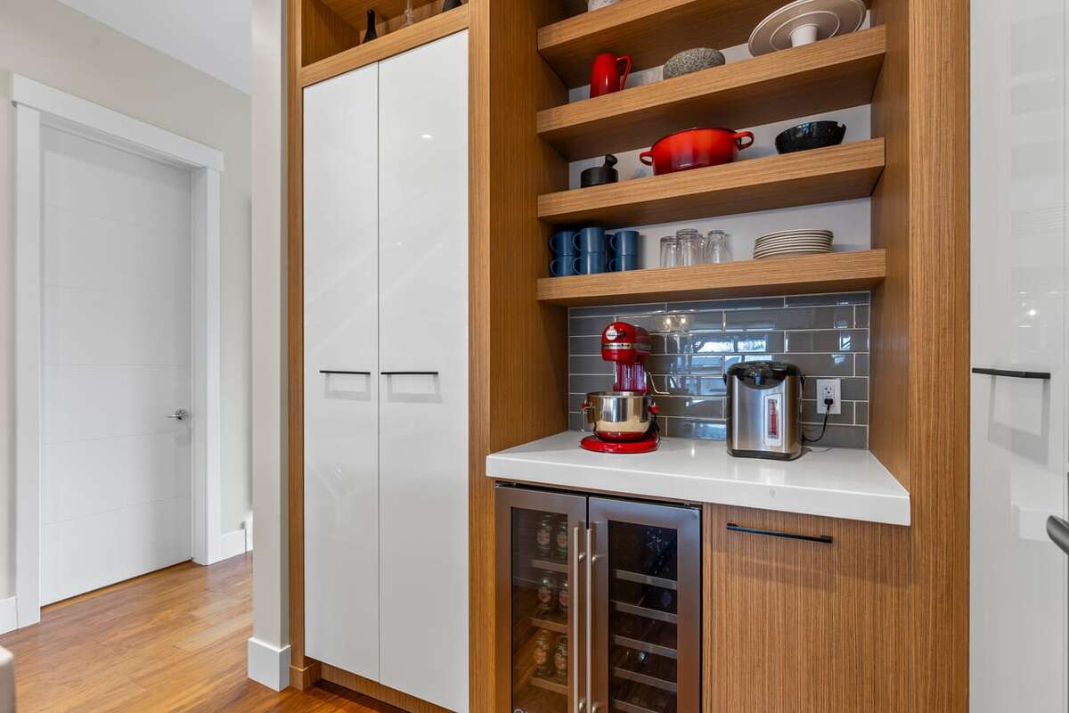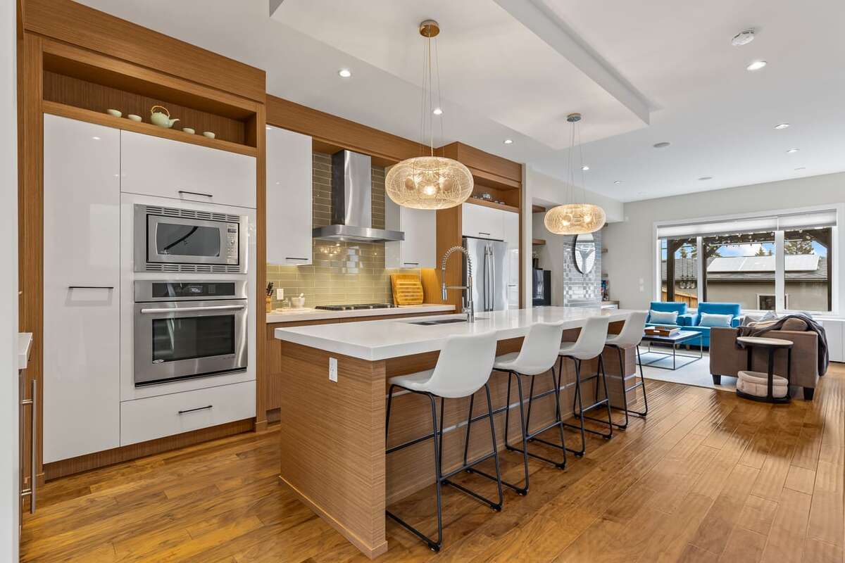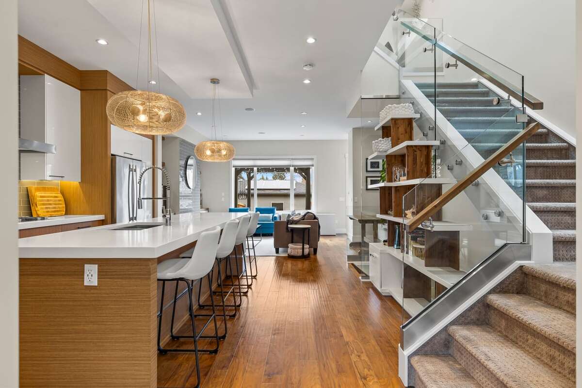 - Main floor boasts soaring 10' ceilings and a bright open-concept layout, complemented by a convenient 2-piece powder room. Abundant natural light floods the space through two skylights above the stairs enhanced by a striking 12mm glass staircase railing—illuminating the centre of the home. The chef-inspired kitchen is a highlight with an impressive 11' long island, 6cm quartz countertops, and custom pull-out cabinetry for ultimate organization. It seamlessly opens to the living room while still offering a separate dining area, perfect for formal and private gatherings.