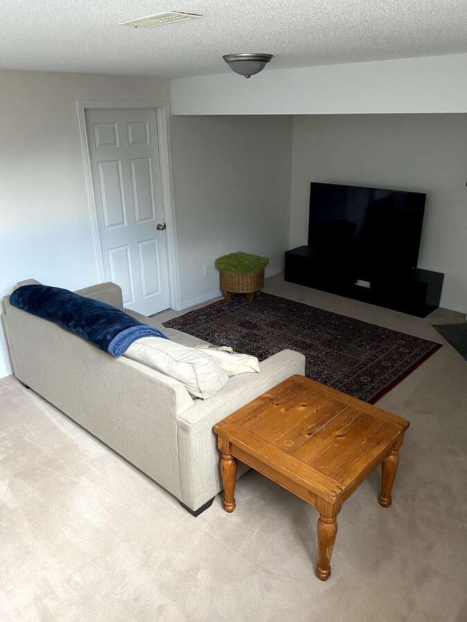 The fully finished basement boasts a large recreational room with a cozy fireplace—perfect for family time, board games, or relaxing evenings.