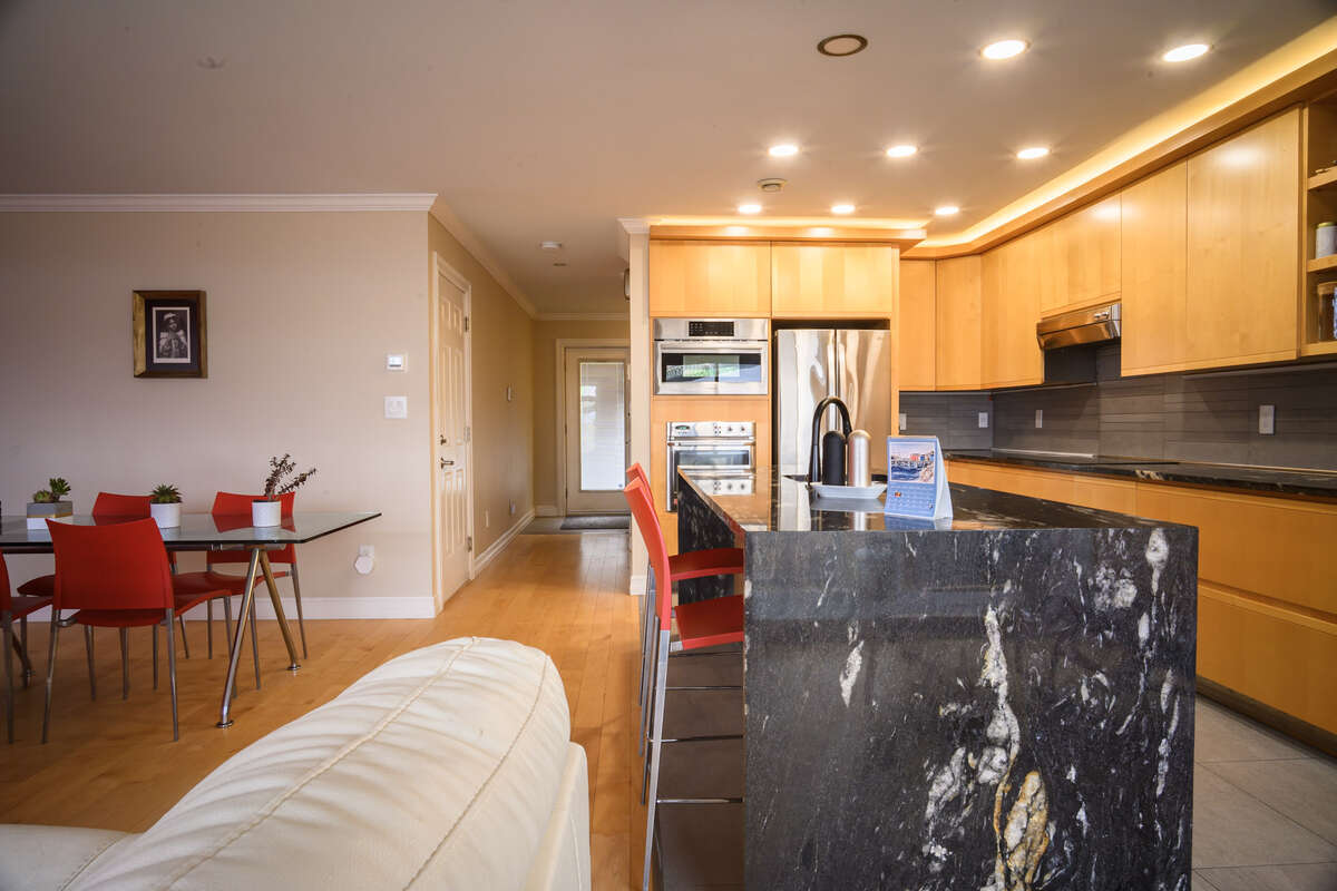 Kitchen 12'0x9'4 Balcony off kitchen – East – Italian Designed Maple custom-made cabinets, black granite countertops with veins, Stainless Steel Appliances – Island with waterfall black granite – Potlights throughout – Backsplash Italian grey ceramic – Custom Design by an Italian Architect