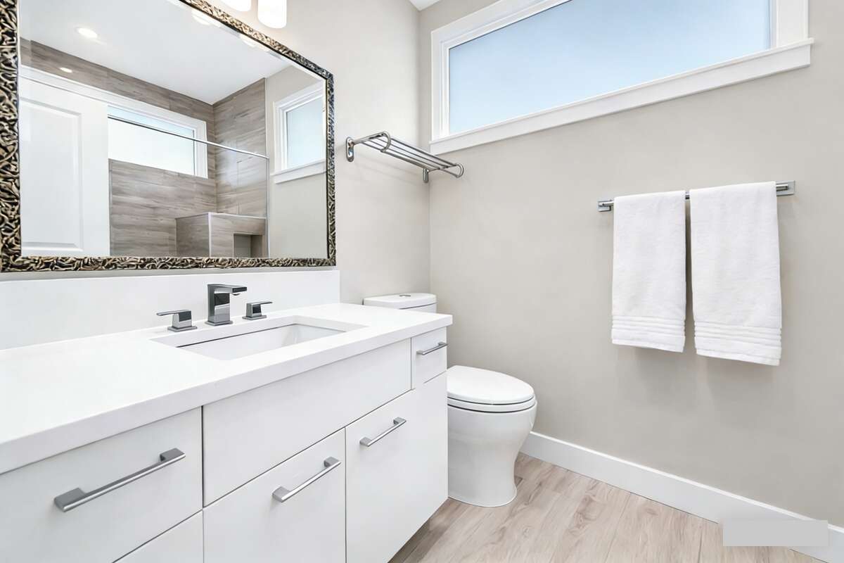 The home offers a bright open-concept main level with high ceilings, laminate flooring, custom millwork, and designer lighting. The gourmet kitchen is equipped with a gas stove, oversized island, quartz countertops and backsplash, stainless steel appliances, and smart Ecobee air conditioning for year-round comfort, controllable via app or voice command.
