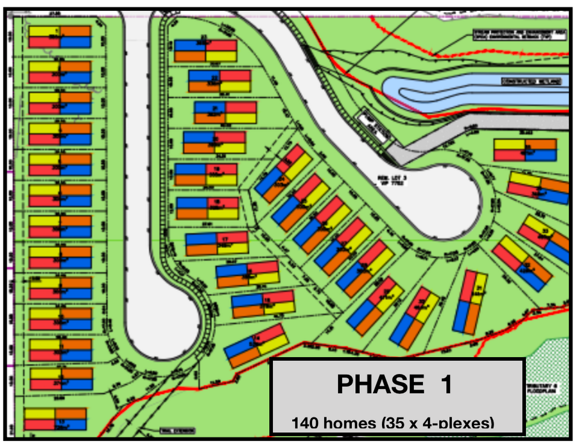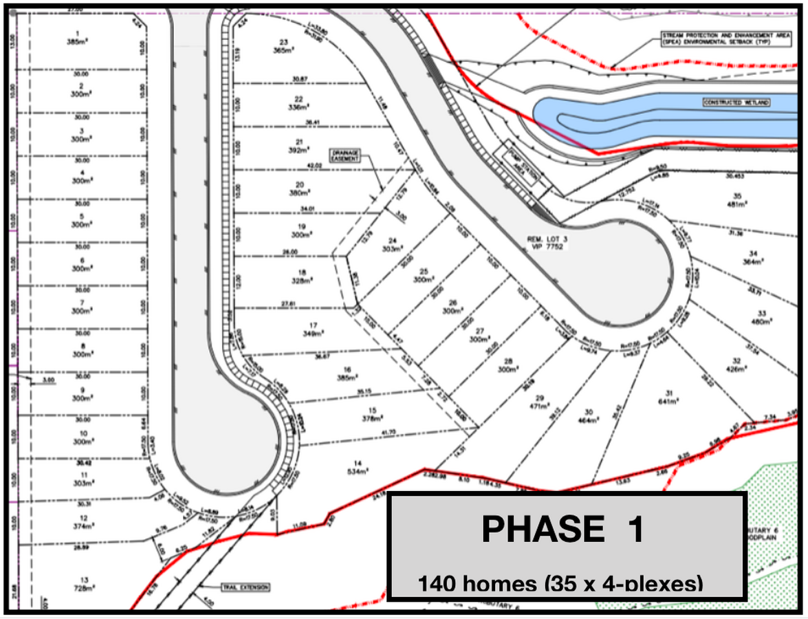 DP approved. Phase 1 is 35 lots for the first 140 homes, or 121 Triplexes, or 70 Duplexes w suites, or just do 35 Single fam w/ suites.