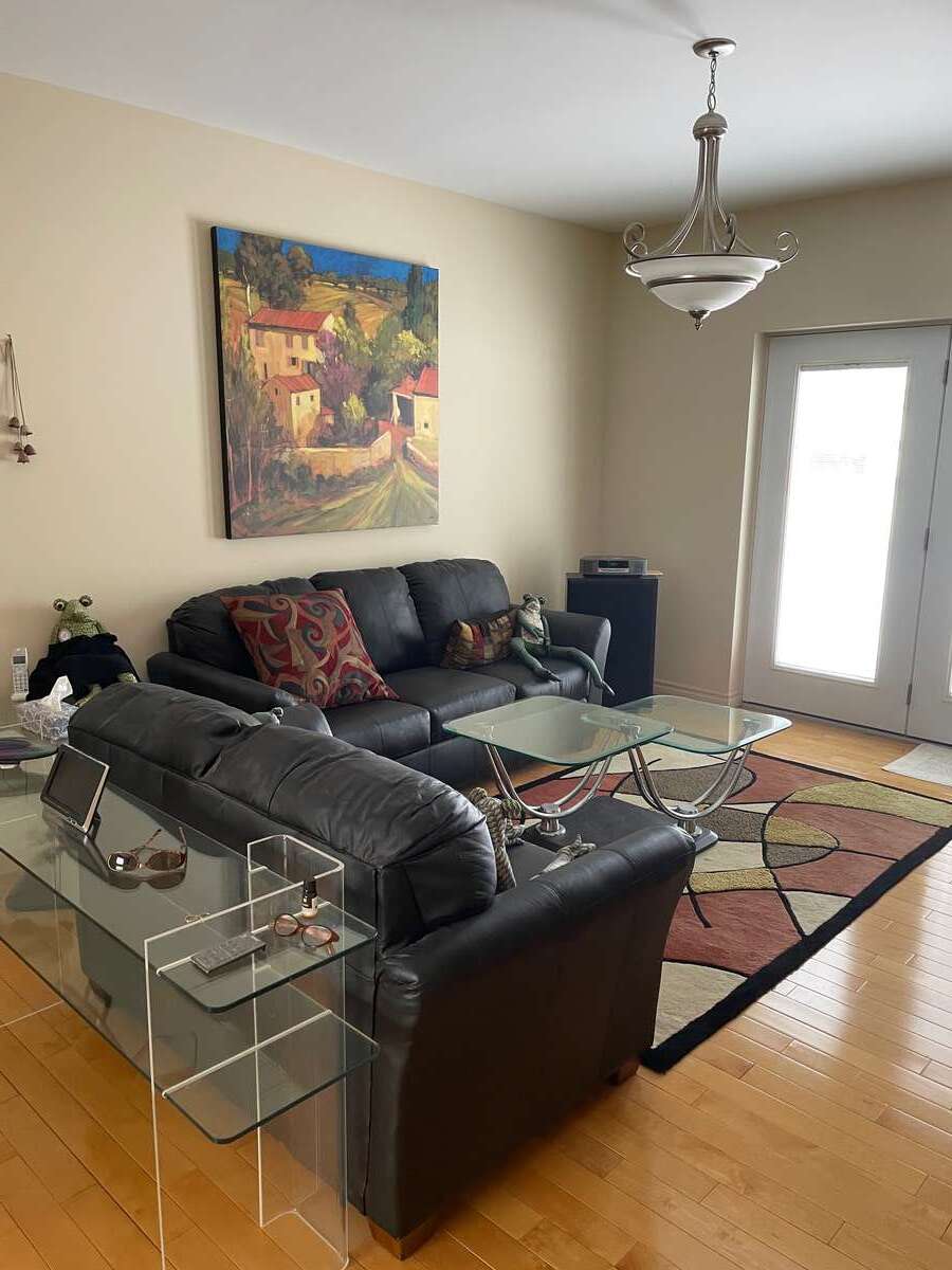 In addition to a master bedroom with ensuite and two additional bedrooms with their own bathroom, the main floor with real hard wood and ceramic flooring is comprised of an open-floor concept den, living-room and foyer, modern kitchen and dining room, a powder room and a separate laundry room. The foyer, bathrooms and kitchen have in-floor heating. Built on a universal design to help people with disabilities or mobility issues, it focuses on maximizing independence, safety, and comfort. Key features include a stone ramp and step-free access, wider doorways, and specialized, lower-height fixtures in bathrooms and kitchen. Four front bay windows let you enjoy the park-setting environment and watch birds feeding or see ships go up and down the magnificent St-Lawrence River from the comfort of your home or the front porch patio.