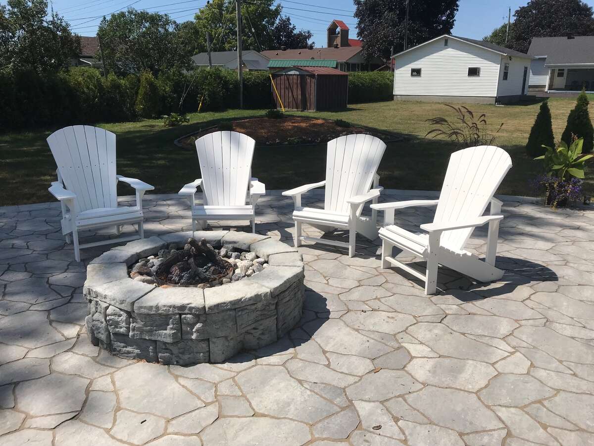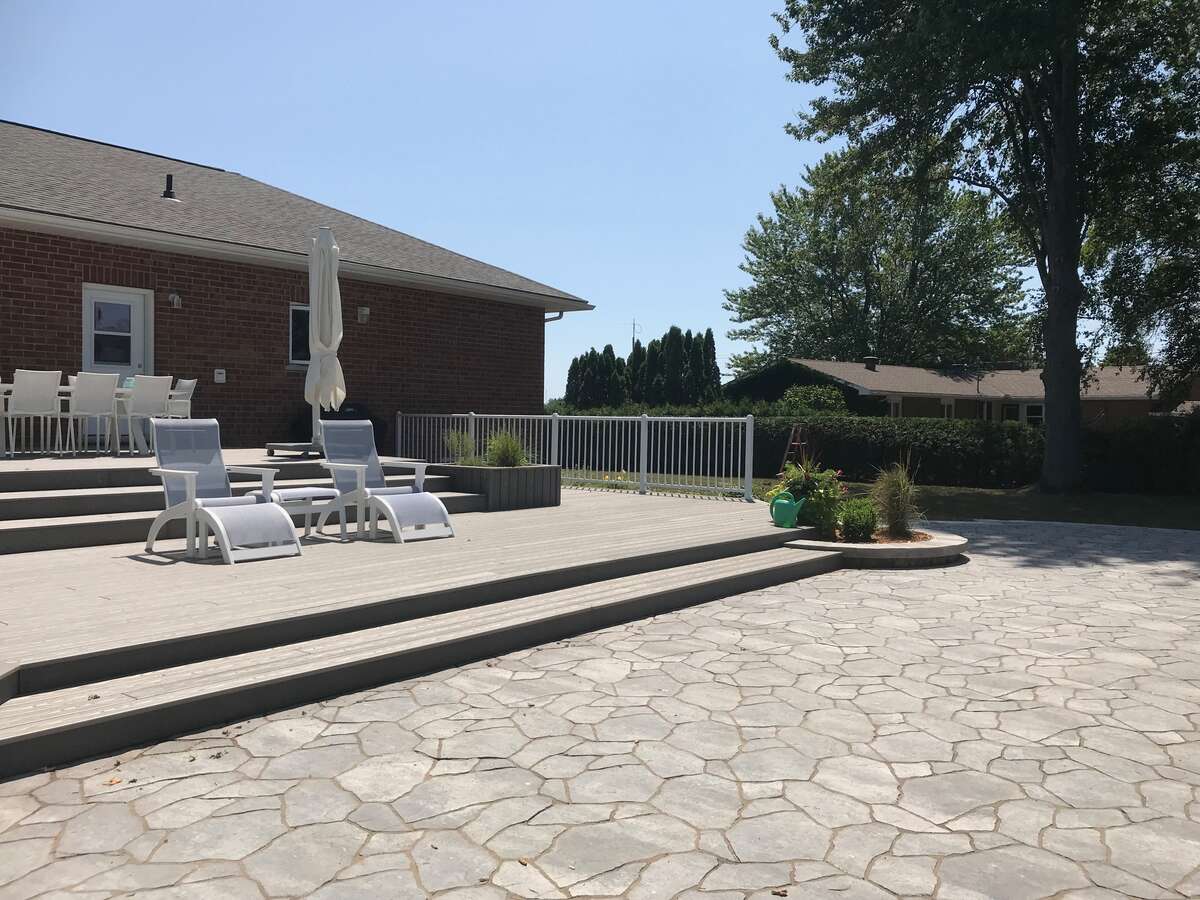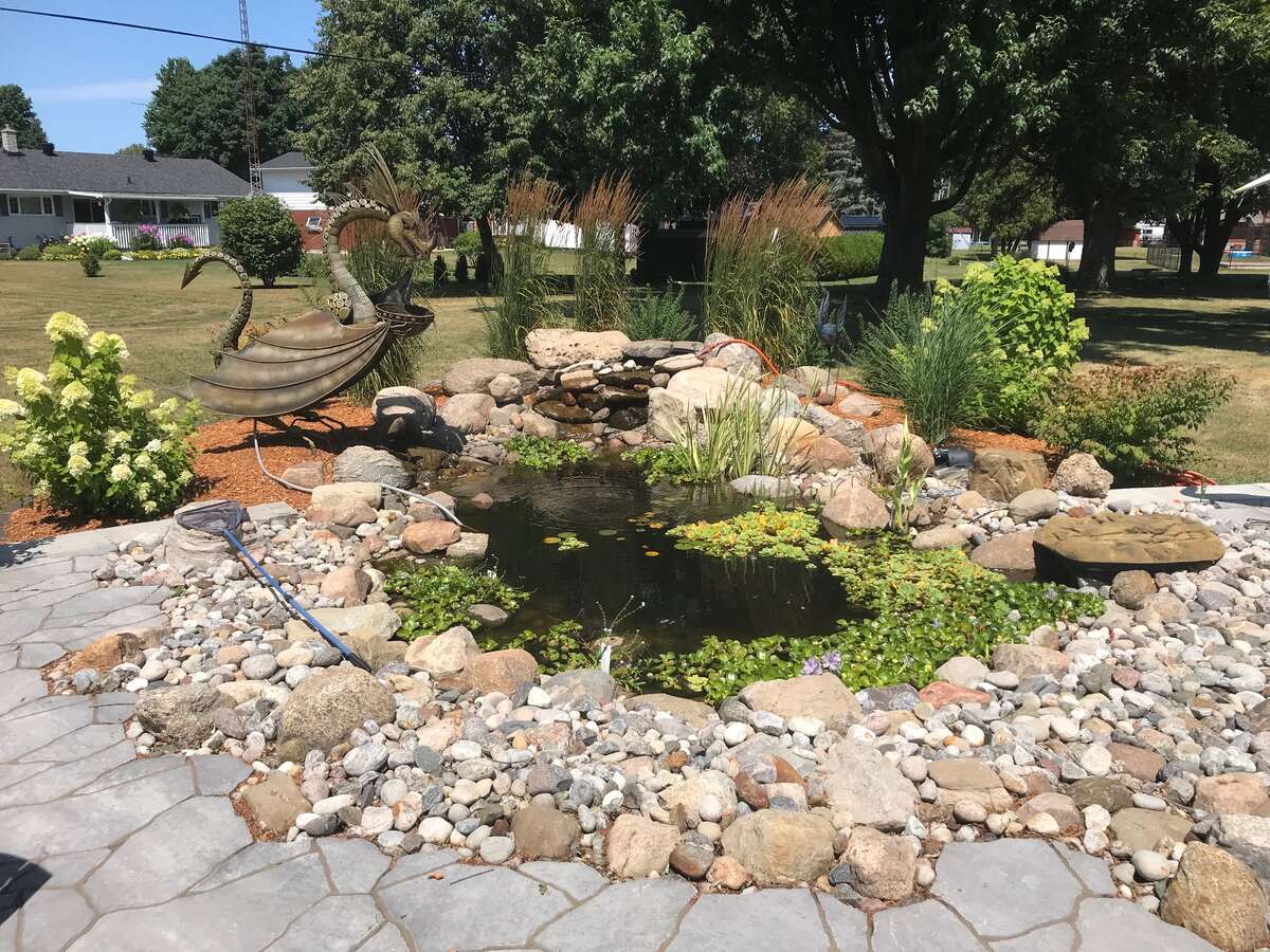 Over $300k in landscape upgrades have been spent over the years on this one-half acre property with mature maple trees, including a paving stones patio around a very large composite two-tier deck and fishpond, Permacon front and back flowerbeds, patio/walkway and retaining walls, a pergola, gas outlets for BBQ and firepit, and an underground four-zone drip irrigation system.
