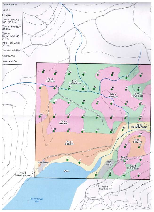 The property has a south facing exposure with gentle to moderate terrain. There is a stream located on the southeast quarter of the property appears to be a source of year round fresh water. There are many different potential building sites. Multiple accesses to bring materials and supplies from Forward harbor and Beaver inlet are possible. The tidal bay would also provide access for a landing craft at high tide.