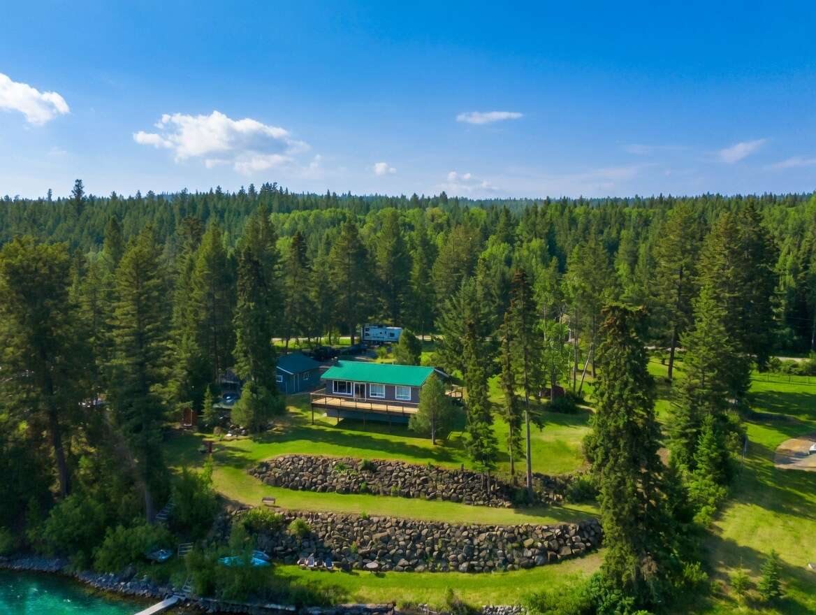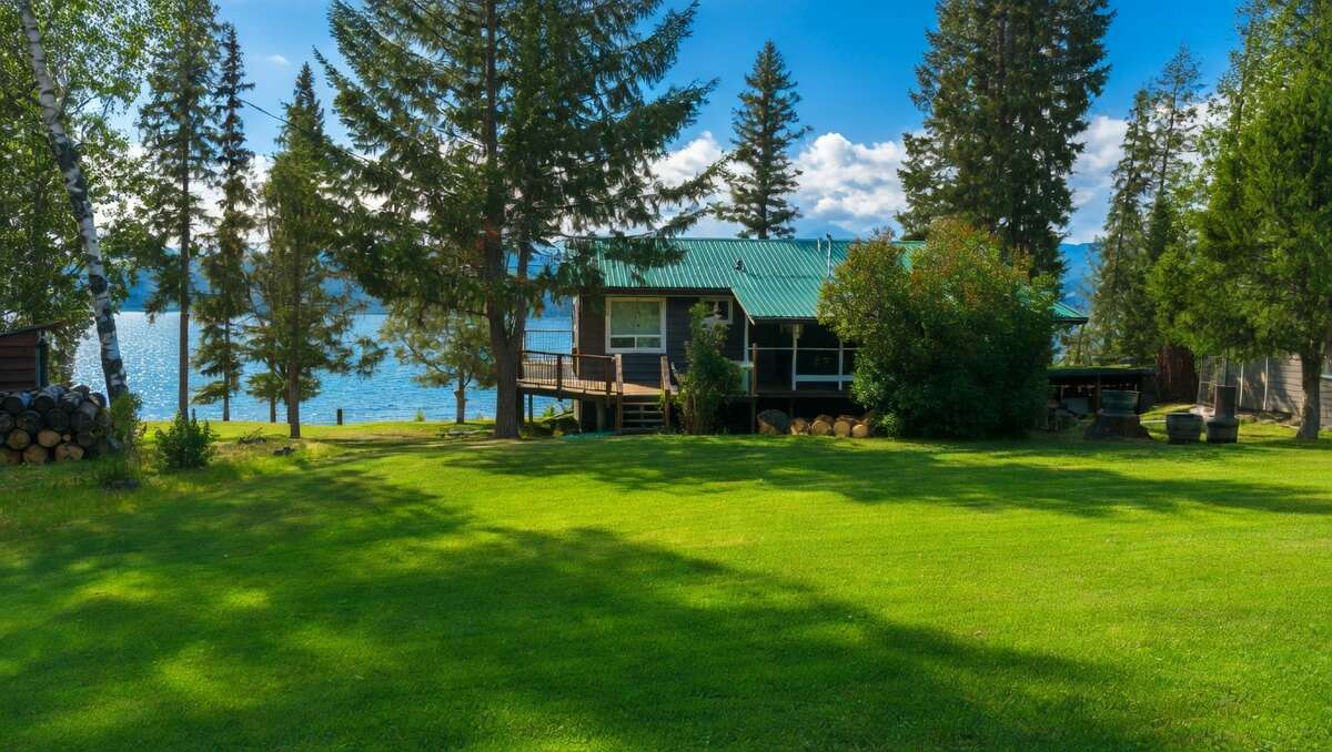The cozy house boasts rustic charm and ample living space in an open floor plan, including a main living area with panoramic lake views, a welcoming wood burning fireplace, and a well-appointed kitchen. There are two bedrooms upstairs, including a large primary bedroom equipped with it's own soaker tub, and over 1,900 sq ft of living space throughout with a walk-out basement and additional sleeping areas downstairs. Plus, outside boasts two comfortable outhouses on the property.