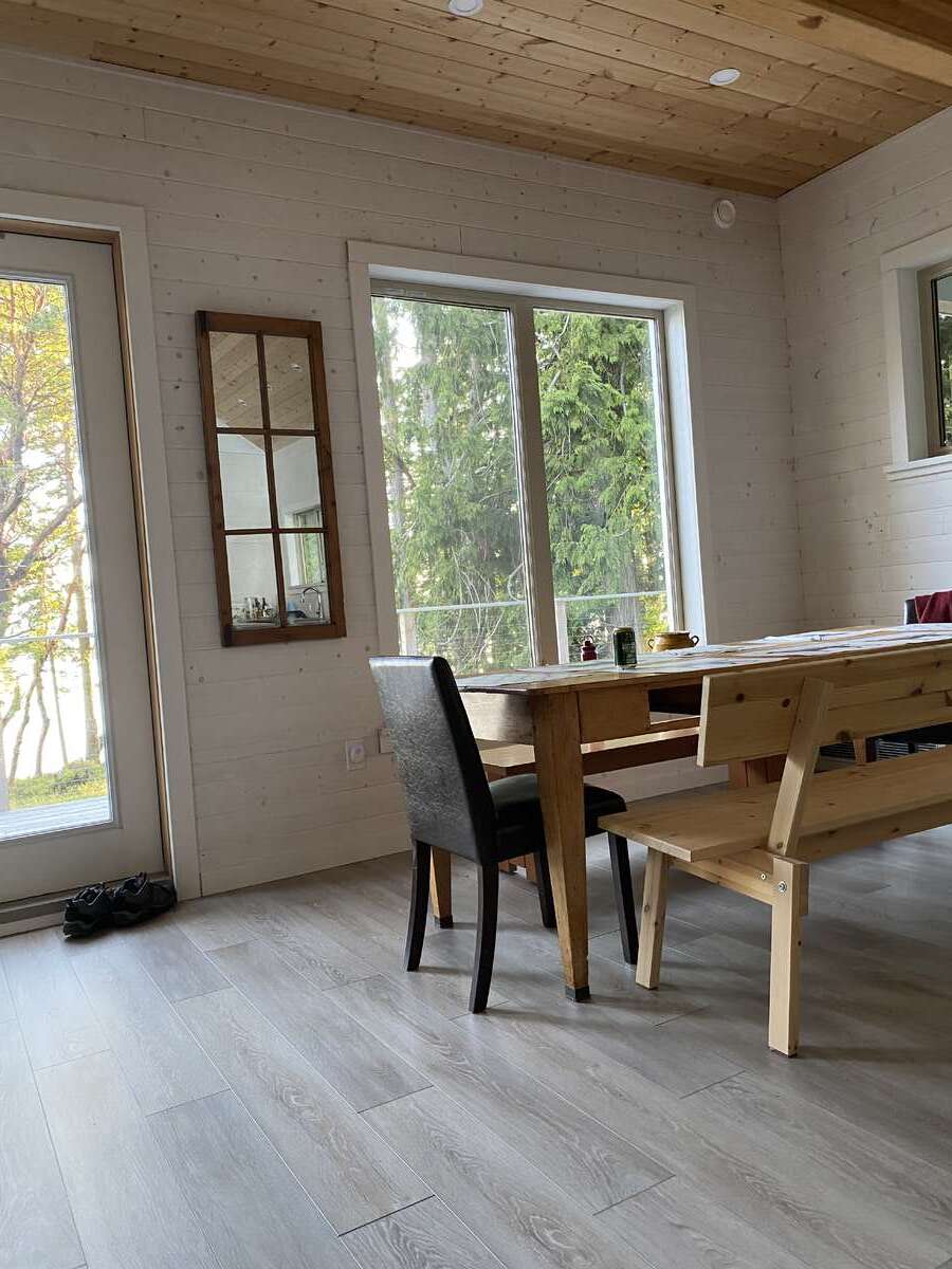 The house is surrounded by decks. Hammocks, on the south side, are slung low to soften falls as young children, almost perpetually amused by them, clamour in and out. The 60 feet of deck across the front of the house are very bright. A great place for reading, eating, talking and mixing. On the west side, next to the dining room and under cover, are the barbecues. With four bedrooms, two bathrooms and a large kitchen, dining area and family room, the cottage has approximately 1900 ft.² of space.